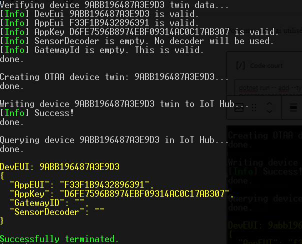 dotnet run — add –type otaa –deveui 9ABB196487A3E9D3 –appeui F33F1B9432896391 –appkey D6FE7596B8974EBF09314AC0C17AB307