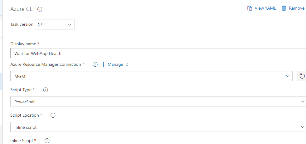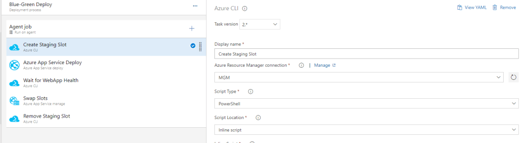 Certaines tâches n’existent pas réellement dans les playbook de Azure Devops, j’ai donc utilisé la tâche Azure CLI fournie par Azure DevOPS me permettant d’exécuter mes propres scripts (PowerShell, PowerShell Core ou même Shell) en bénéficiant de la CLI Azure (c.f : azure-pipelines-tasks/Readme.md at master · microsoft/azure-pipelines-tasks (github.com)).