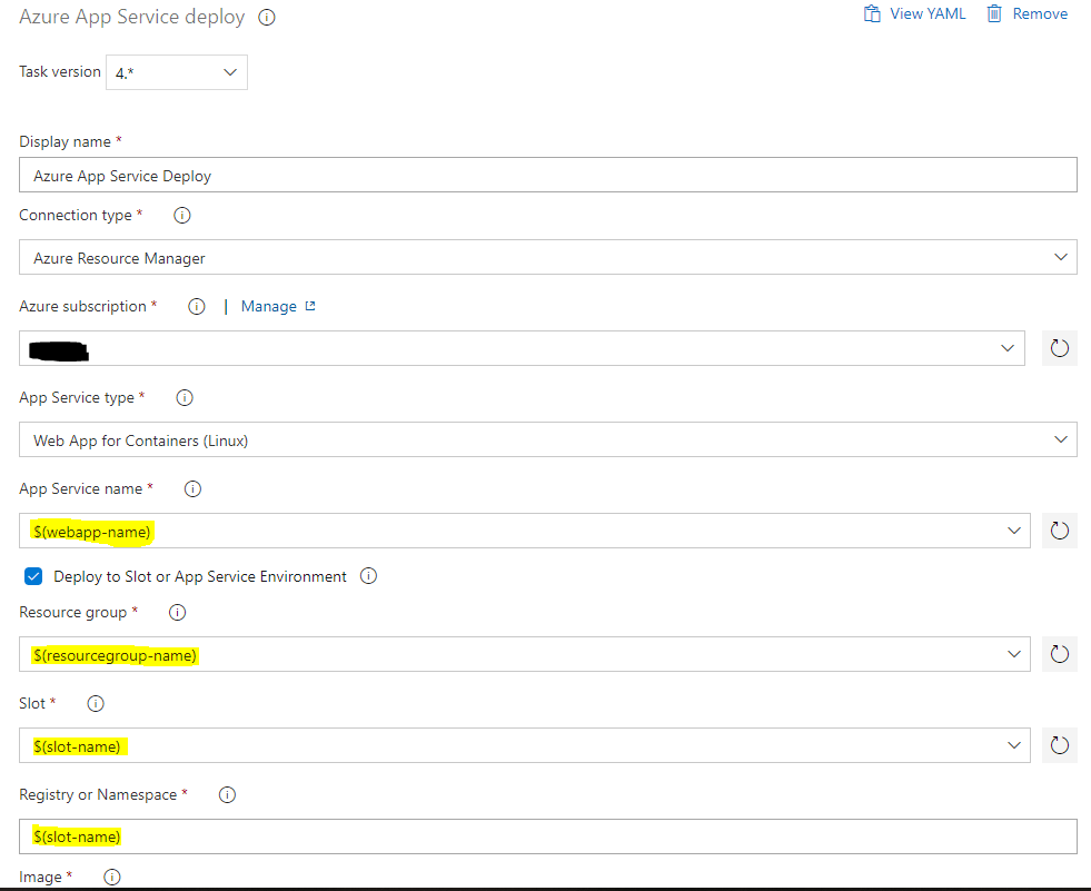 L’interface de Azure Devops, va normalement nous aider dans la sélection de nos ressources à déployer (avec des select box). Or dans notre cas, nos ressources ne sont pas créées lors de la définition du pipeline nous allons donc devoir les positionner à la main, j’utilise donc les varibles d’environnement de notre pipeline (que nous avons auparavant définis).