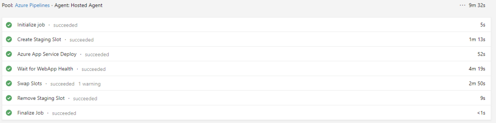 Il faudra cependant porter une attention particulière au Health Check qui se base sur un Endpoint qui ne donne que l’information du warmup de l’application. Il vous appartient de vérifier que votre application est dans un bon état de santé avant de réaliser le Swap (tests exhaustif des composants de votre application, …).