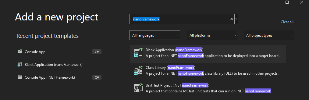 C’est parti maintenant pour réaliser le programme embarqué en C#. Pour cela j’ouvre mon plus beau IDE (Visual Studio 2022) et je démarre un nouveau projet nanoFramework: