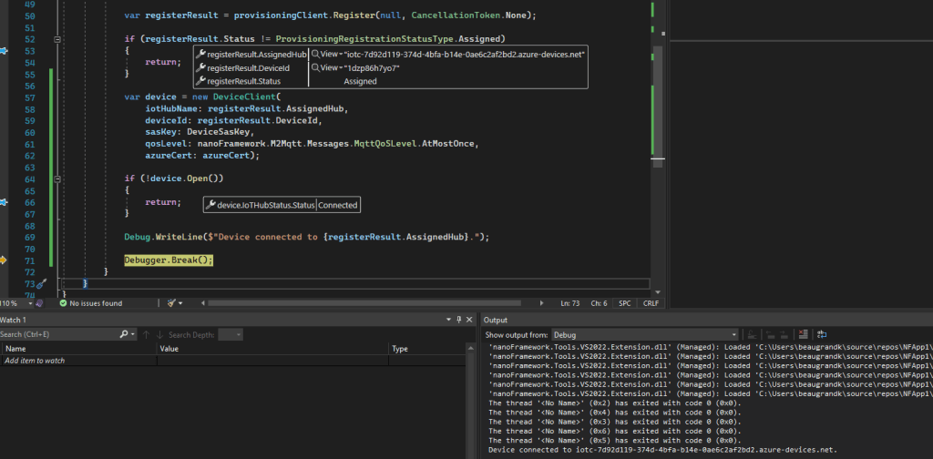 J’ai attaché des watch dans le debugger me permettant de confirmer que les opérations se sont bien passées, mon appareil s’est provisionné dans le DPS puis connecté dans IoT Hub.