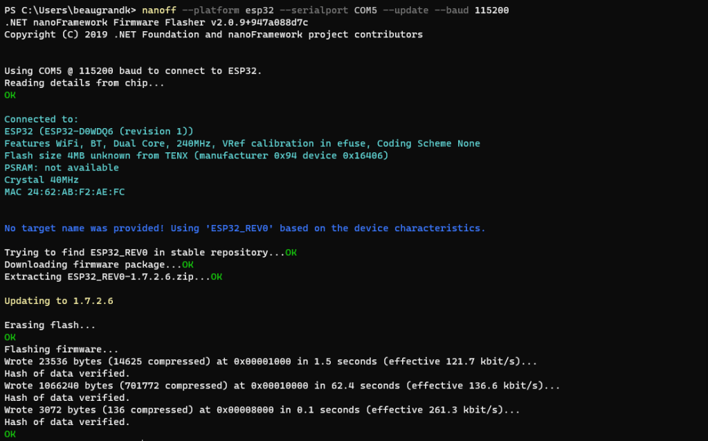 Comme je vous l’ai expliqué, ce produit s’appuie sur un RTOS et un ensemble de librairies (un Firmare en sommes) qui seront déployés sur votre appareil. L’équipe .NET nanoFramework nous facilite alors les choses en nous proposant d’installer une fois pour toute le firmware sur votre appareil puis de vous concentrer sur votre code applicatif.