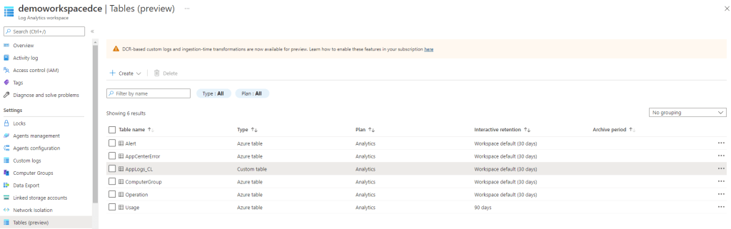 Après avoir modifié l’ ID de la ressource (celui du Log Analytics workspace) et lancé le script PowerShell, nous pouvons retrouver la nouvelle table dans le portail Azure.